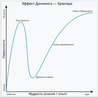 Большинство людей всю жизнь пребывают на этом «Пике Глупости» и прекрасно там себя чувствуют. У них на всё есть «своё» мнение, как правило, на уровне школьной программы. Если же человек по мере взросления и накопления опыта, начинает сомневаться в своих знаниях всего, то его самоуверенность начинает рушиться, и он оказывается в «долине отчаяния».
