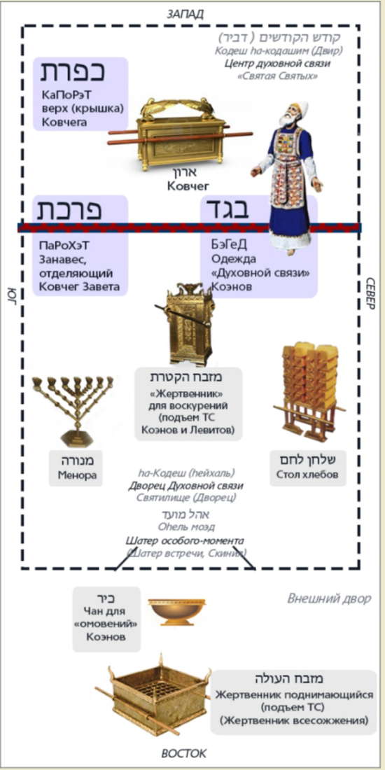 На иврите все эти понятия описаны 7 Двойственными: Капорет (Крышка на Ковчеге Завета), Парохет (Занавес отделявший Святая Святых), Бегед — одежда Первосвященника. Мы остановимся на этом чуть ниже.